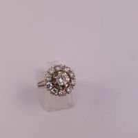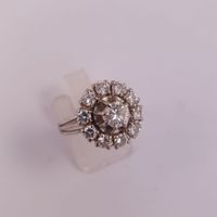 Bague fleur en or gris 750 mil. et platine 950 mil. serti d’un diamant de 0,30 carat environ, dans un entourage de diamants brillantés. (TDD : 51). 4,9 g. Brut.