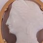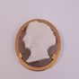 Broche en or 750 mil. centrée d’un important camée agate au profil féminin. Dimensions : 5 x 4 cm. 30,4 g. Brut.