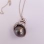 Chaîne en or gris 750 mil. retenant un pendentif en platine 850 mil. orné d’une perle baroque grise rehaussée d’un anneau partiellement diamanté. (Longueur chaîne : 48 cm et hauteur pendentif : 2,4 cm environ). 10,7 g. Brut.
