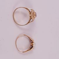 Deux bagues en or 750 mil. (diamants, rubis, perle de culture) (TDD : 53 et 48) (Pierre manquante, déformation, perle usée). 6,4 g. Brut.