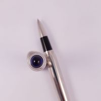 Stylo-roller R de CARTIER, corps en métal, capuchon en métal gravé, cabochon en résine bleue, signé et numéroté. (Longueur : 14,5 cm environ)