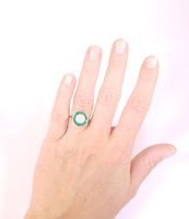 Bague 2 ors 750 mil à chaton rond centré d’un pavage de diamants taille brillant dans un entourage d’émeraudes calibrées. (TDD : 52,5). (Egrisures, petits manques de matière). 4,3 g. brut