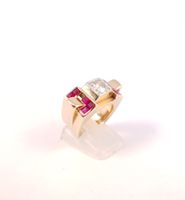 Bague tank en or 750 mil et platine 850 mil centrée d’un diamant taille ancienne de 0.70 carat environ, à épaulements à gradins rehaussés de pierres de synthèse rouges calibrées. Travail des années 1940. (TDD : 53,5). (Une pierre manquante, égrisures). 14,1 g. brut