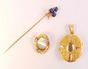 Epingle de cravate en or 750 mil à décor d’un trèfle serti de saphirs et diamants taillés en rose. (Déformations). Pendentif médaillon ouvrant et Broche « Fleur » en or 750 mil (turquoise, perles de culture, pierre décorative cassée). 15,7 g. brut