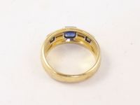 Bague jonc en or 750 mil centrée d'un saphir rectangulaire à pans coupés épauilé par deux diamants princesse (TDD : 62). 9,3 g brut.
