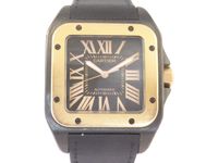 E) Art 524 bis du CGI al C : Bracelet-montre d'homme en acier noirci et or 750 mil, boîtier carré (Dim. 38 mms environ) à lunette en or 750 mil, cadran noir à chiffres romains, tour de bras en caoutchouc, CARTIER, Santos 100, mouvement automatique (petites rayures sur lunette, pierre du remontoir accidentée). 136,9 g brut.