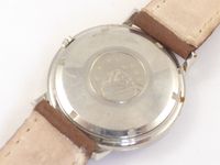 Montre-bracelet d'homme en acier, boîtier rond (Dim 35 mms environ), cadran piqué argenté à index bâton et guichet dateur, tour de bras en cuir usé, OMEGA, mouvement automatique (verre fêlé).