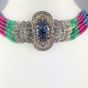 Collier ras de cou en or gris 750 mil., 585 mil. et en argent 800 mil. centré d’une racine de saphir gravé, serti de roses, et de 5 rangs de perles de pierres de couleurs. (Longueur réglable : 35, 37 et 39,5 cm). 52,1 g. brut