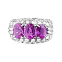 Bague en or gris 750 millièmes ornée au centre de trois pierres fines roses de forme ovale, entre deux pavages de diamants ronds de taille brillant. (Égrisures et marque de mise à grandeur). Tour de doigt : 51. Poids brut : 8,9 g