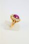 Bague en or jaune 750 millièmes ornée au centre d'un rubis ovale dans un entourage de dix diamants ronds de taille brillant. Egrisures. Tour de doigt : 47 1/2 Poids brut : 4,8 g Accompagné d'un rapport de CGL n°21787 de juin 2020 - Masse estimation : 1,70 ct - Couleur : rouge pourpre intense - Provenance : Myanmar - Pas de modification thermique constatée - Dimensions : 8,8 x 7,3 x 3,1 cm