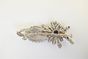 Broche en or gris 750 millièmes et platine 850 millièmes à décor de fleur stylisée, ornée au centre d'un saphir coussin dans un entourage de diamants ronds de taille brillant et taillés en 8/8. (Égrisures au saphir). Hauteur : 4,8 cm. Poids brut : 12,5 g