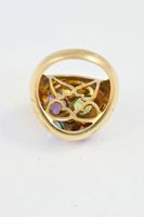 BULGARI Bague en jaune 750 millièmes de forme bombée, le centre orné d'un diamant rond de taille brillant entre quatre motifs cœurs sertis de pierres fines (améthyste, péridot...) (Égrisures et manques)Signée. Tour de doigt : 53. Poids brut : 14,7 g