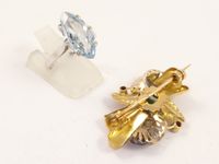 Bague marquise en gris 750 mil ornée d'une topaze navette (TDD : 52), Broche florale en or 750 mil centrée d'une émeraude racine et de pierres imitation. 9,6 g brut.