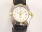 Montre-bracelet de dame en acier, boîtier rond (Diam 26 mms) à lunette tournante, cadran blanc à index bâton, chiffres arabes et guichet dateur, bracelet en cuir usé, BREITLING, Callistino, mouvement quartz.