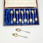 ALEXANDRE TORTEZ (actif 1891-1898) : suite de 12 cuillers à café ou à thé en argent 950 mil. les cuillerons en vermeil, modèle à rocaille déchiquetée asymétrique et croisillons. Non chiffrées. Poinçon pour les menus ouvrages à la tête de sanglier et d’orfèvre. Poids : 160.6 g. Dans leur écrin d’origine défraichi avec soie accidentée. Rayures. L. 13.8 cm.