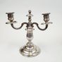 CHRISTOFLE, XXE, Années 1950 : bout de table à 3 bras et 3 feux en argent (950 mil.), modèle contour à moulure de doucines, ombilic fileté, le fût balustre à côtes de melon, les binets tulipe. Minerve 1er titre et crabe pour les menus ouvrages. Poinçons de Maître de Christofle (partiellement lisible) et de marque à la balance pour l’argent massif dans les années 1950. Poids : 843.4 g. H. 22 cm. + 1 bout de table à 2 feux en métal argenté du XXe siècle, modèle contour à moulures de doucines, le fût balustre. Poinçon de fabricant PC Tête de Coq. (H. 20 cm)