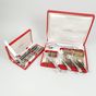 FRIONNET-FRANCOIS, XXe siècle : ménagère de 48 pièces en métal argenté, modèle à volutes et rinceaux feuillagées, comprenant dans 2 écrins défraichis de la maison, 12 grandes fourchettes, 12 grandes cuillers et 12 cuillers à café et 1 louche d’une part et d’autre part 11 grands couteaux lames inox signées. Rayures d’usage. Non chiffrée. Le petit écrin des couteaux accidenté.