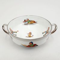 HAVILAND, XXe siècle : petite écuelle pour bébé en porcelaine blanche et argent à décor polychrome de jeunes enfants skiant, faisant de la luge, conduisant ou hockeyant. Signée. TBE. Diam. 12 cm. H. 4.8 cm. L. aux anses : 15.2 cm