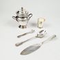 Lot CHRISTOFLE en métal argenté, production contemporaine : - 1 cuiller bébé FANFAN (L. 15 cm) non chiffrée. - 1 timbale tulipe (argenture du tour du col cloquée). - 1 cuiller de service à salade et 1 pelle de service CLUNY chiffrées OC.+ 1 sucrier couvert balustre en métal argenté non chiffré à petites perles et filets rubanés de la fin du XIXe-début du XXe siècle. H. 17.5 cm. Taches internes. Légères rayures.