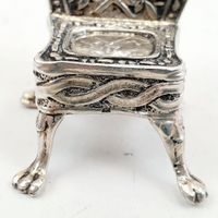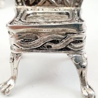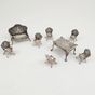 Petit salon et salle à manger miniatures en argent 800 mil. de la fin du XIXe siècle comprenant 1 canapé, 2 fauteuils, 4 chaises et 1 table à décor à décor de bouquets, vasque et cornes d’abondances à couronnes de lauriers. Poinçons Charançons d’importation après 1893. Travail étranger probablement hollandais. Poids : 186.5 g. Oxydations. Dim. de la table : 4 x 6.2 x 4.8 cm. H. des fauteuils et chaises : 4.3 cm. Dim. du canapé : 6 x 7 cm.