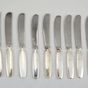 RAVINET D’ENFERT, PRESIDENT, vers 1960 : suite de 12 petits couteaux en métal argenté signés, les lames inox à bouts arrondis. Modèle uniplat moderniste. L. 18.9 cm. Rayures. Une création selon une publicité des années 1960 de la maison pour un service qui « préside aux grandes heures de la gastronomie ».