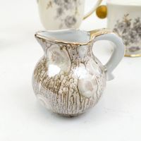 Service à thé ou café en porcelaine de Limoges, XXe en porcelaine blanc crème et or de RAYNAUD & Co, revendu par G. BURLET à Chalons sur Saône, à décor de bouquet au naturel de fleurs de couleur parme comprenant 1 cafetière tulipe sur piédouche rond (H. 22 cm), 1 sucrier, 1 pot à lait, 12 tasses à café (diam. 9 cm) et 12 soucoupes (diam. 13 cm). Cachets. + 1 petit pot à lait en porcelaine de Limoges moderne et 1 mini vase en porcelaine japonaise façon Satsuma.