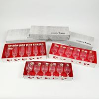 Service LOUVRE de la fin du XXe siècle de 18 verres à pied en cristal d’ARQUES (+ de 24% de plomb) de la maison J.C. DURAND & Cie, comprenant dans 3 boîtes 6 verres à eau, 6 verres à vin et 6 flûtes à champagne. Modèle à pied circulaire, la jambe à pans et la paraison à frise biseautée. Etiquettes. H. 16.8 cm, 13.8 cm et 12.5 cm. Micro-rayures. TBE. La verrerie J.C. DURAND & Cie se trouve à ARQUES dans le Pas-de-Calais. Elle crée en 1983 la marque Cristal d’Arques. Elle fait partie maintenant du groupe ARC INTERNATIONAL dont les 5 marques sont Luminarc, Arcopal, Cristal d’Arques, Arcoroc et Chef & Sommelier avec 60% de sa production en grandes surfaces.