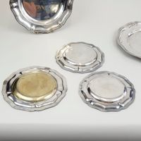 Six plats ronds en métal argenté de différents orfèvres, modèle contour à filets : - 2 petites assiettes à 5 contours ROUX-MARQUIAND (diam. 21.5 cm).- 1 grande assiette à 5 contours (diam. 24.5 cm – son fond non argenté) signée D. GERARD.- 1 plat à 6 contours de la maison CHRISTOFLE (diam. 30 cm) numéroté 712985 (poinçon période 1862-1935). - 2 plats à 5 contours (diam. 32,2 cm et 31.9 cm) (l’un signé de la maison PLASAIT avec poinçon de Maître). Légères rayures et petites taches noires sur l’un des grands. TBE de l’ensemble. Non chiffrés.