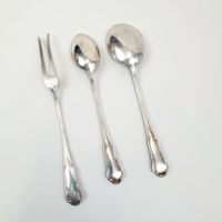 WILKENS & Söhne, Allemagne, XXe siècle : 3 pièces de service en argent 800 mil. modèle filet à spatule chantournée comprenant 2 cuillers de service (L. 25 et 25.7 cm) et 1 grande fourchette à viande (L. 27.2 cm). Poinçons allemands et Cygne. Poids : 269.2 g. rayures d’usage.