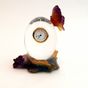 DAUM FRANCE, Pendule de table « au papillon » à corps ovoïde en cristal incolore, boîtier rond inscrit dans le cristal avec cadran blanc à chiffres romains, et décor en pâte de verre polychrome. Signée sous la base. Hauteur : 11 cm.