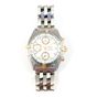 Bracelet-montre d'homme BREITLING chronographe en acier et métal doré, boîtier rond, lunette tournante graduée, cadran ivoire à 3 compteurs, index bâton doré, guichet dateur à 3 H, mouvement automatique, sur bracelet en acier à boucle déployante signée. (Diamètre boîtier : 40 mm, longueur du bracelet : 17 cm environ).