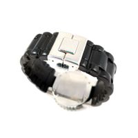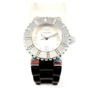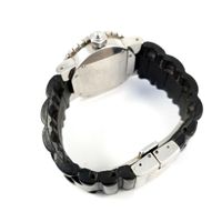 Montre-bracelet de dame CHAUMET Class One en acier, boîtier rond, lunette tournante sertie de diamants brillantés, cadran gris à chiffres romains et index diamantés, guichet dateur à 6 H, mouvement à quartz, sur bracelet en caoutchouc noir à boucle déployante papillon en acier signée (diamètre : 33 mm, longueur : 14,5 cm).