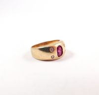 Bague jonc en or 585 mil centrée d’un rubis ovale en serti clos épaulé de diamants tailles 8/8 et brillant. (TDD : 52,5). (Egrisures). 5,8 g. brut