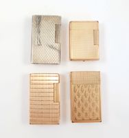 Lot de 4 briquets DUPONT de tailles variées, dont 1 en métal argenté et 3 en métal doré guillochés et rainurés, l’un plus spécifiquement à décor de fleurs de lys. Signés et numérotés. (Deux chiffrés, usures, chocs).