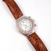 Montre-bracelet de dame TECHNOMARINE « TechnoDiamond » chronographe en acier, boîtier rond, lunette tournante unidirectionnelle à deux rangs de diamants taille brillant, cadran nacre à index diamantés, à 3 compteurs secondaires et guichet dateur à 4H, mouvement à quartz, sur bracelet cuir marron usé à boucle ardillon en acier non d’origine. Signée et numérotée. (Diamètre boîtier : 40mm environ).