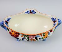 GIEN, Jardinière "Bernard à anses" en faïence fine à décor polychrome aux pivoines, piètement quadripode, marque au tampon (1984-1989). Dimensions : 18 x 43 x 24 cm.