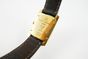 Montre-bracelet de dame BAUME ET MERCIER "Hampton" en or 750 mil., boîtier rectangulaire, cadran crème partiellement guilloché, index point et chiffres arabes appliqués, petite seconde à 6H, mouvement à quartz, bracelet en cuir noir, boucle déployante siglée et signée en métal doré, signée et numérotée (dim. : 35 x 23 mm) (usures, rayures). 36,3 g brut