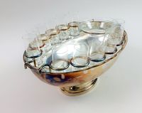 SAINT-HILAIRE, Rafraîchissoir à caviar et vodka en métal argenté composé d'une coupe ovale sur piédouche contenant 12 verres à vodka et une coupelle en verre, signé. Longueur : 5 cm. Largeur : 24,5 cm. Avec une boîte.