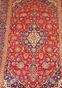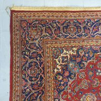 Tapis d'Orient en laine à médaillon central et 4 écoinçons, à décor et semis de fleurs, champ rouge et bleu nuit. Dimensiosn : 221 x 138 cm. (Franges coupées d'un côté)