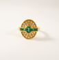 Bague en or 750 mil à chaton ovale pavé de diamants taille brillant, centré d’émeraudes, ovale et calibrées. (TDD : 53). 3,9 g. brut