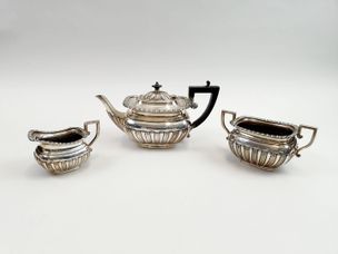 400 / 600 €SHEFFIELD, ANGLETERRE, 1921 : Service à thé (3 pièces) en argent 925 mil. comprenant 1 théière, 1 pot à lait et 1 sucrier. Modèle de forme rectangulaire à canaux et godrons reposant sur une petite base. La prise et frétel de la théière en bois vernis. Travail anglais de Sheffield, vers 1921. Poinçons anglais d'orfèvre J & T, de ville et lettre date d. Poids brut total : 1416,1 g. Dimensions de la théière : H. 15 cm. Longueur. 27.5 cm. Largeur : 13 cm. Sucrier : H. 9.6 cm et pot à lait : H. 8.3 cm. Manque la goupillle inférieure de l'anse en bois de la théière. TBE général. Non chiffré.Vers 1900 : Rond de serviette en argent 950 mil. d