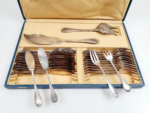 60 / 80 €RAVINET d'ENFERT & CIE, Années 1930 : suite en métal argenté de 12 couverts à poisson et leur couvert de service à spatule piriforme moulurée et perlée. Poinçon actif après 1923. Les tiges des couverts sont signées TEMPLIER. Non chiffrée. Légères rayures. L d'un couvert : 17.2 et 20 cm. Couvert de service : 28.2 et 23.8 cm. Ecrin de détaillant à Casablanca d'origine (défraichi à l'extérieur).Sucrier couvert (H. 15.7 cm) et pot à lait (H. 13.