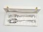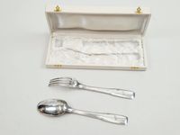 BOULENGER, XXe siècle : 1 grand couvert en argent 950 mil. Spatule uniplat moulurée de pans. Chiffré ANNE. Ancienne Minerve 1er titre et poinçon de Maître au croissant de lune. Poids : 172.5 g. L. 21 cm. TBE. Ecrin blanc cadeau de naissance.