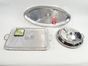GUY DEGRENNE, XXe siècle : service de platerie GODRONS en inox finition satinée comprenant 1 plateau de service (45 cm) (L. aux anses : 53 cm), 1 plat à poisson (60 cm), 1 plat rond (30 cm), 1 légumier couvert (22 cm). TBE. Notice.