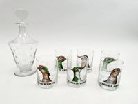 HENKEL, XXe siècle : suite de 6 gobelets de chasse en verre à décor polychrome de profils d’oiseaux titrés : canard sauvage, sarcelle d’hiver, bécasse des bois, perdrix grise, vanneau huppé, faisan de chasse. Cachet. Dans une boîte Verrerie d’Auteuil défraichie. H. 10.2 cm. Diam. 8 cm. Micro-rayures. + 1 carafe triangulaire des années 1930 sur piédouche en verre cristallin à décor gravé d’un semis d’étoiles, bouchon postérieur non d’origine. H. 27.5 cm. Micro-rayures.