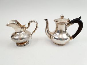 HENRI SOUFFLOT (actif 1884-1910), fin XIXe siècle : ménagère de 94 pièces en argent 950 mil. modèle rocaille déchiquetée à spatule asymétrique comprenant 12 grandes fourchettes (L. 21.3 cm), 12 grandes cuillers (L. 21.5 cm), 12 fourchettes (L. 18.3 cm) et 12 cuillers (18.5 cm) à entremets, 12 grands et 11 petits couteaux les manches fourrés et lames acier, 13 cuillers à café dont 7 plus petites (L. 13.7 et 13 cm), 2 cuillers à ragoût (L. 26 cm), 1 louche (L. 33.2 cm), 1 cuiller à sauce, 1 passe-thé, 1 couvert à salade manche fourré, 1 manche à gigot tulipe et 1 couvert à découper les hauts acier ou argenté, les manches fourrés. Minerve 1er titre de 1838 et poinçon de Maître HS soleil levant étoile (sauf sur les pièces fourrées).Poids d’argent net : 4094.2 g.Poids d’argent fourré : 1854.1 gRayures, légères oxydations des couteaux et déformations d’usage. Non chiffrée. Dans son coffret d'origine (défraichi et fendu).+ 1 passe-thé ART NOUVEAU de la WMF en métal argenté.