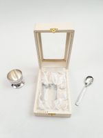 Lot en métal argenté :- Bonbonnière vers 1900 de l’orfèvrerie OF LUTETIA à décor néo-classique de cartouches, balustrades avec feuillages, guirlandes et godrons. Petites piqûres, rayures, déformations à la base. - Service bébé comprenant dans son écrin à lucarne transparente : 1 coquetier ERCUIS (H. 4.4 cm) et 1 cuiller à œuf (L.10.8 cm). Production moderne. TBE.