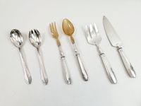 Lot en métal argenté de 3 couverts de service : - Couvert à salade modèle navette ART DECO à pans et godrons, les hauts en corne blonde. L. 28.7et 29 cm. Rayures, BE.- 1 Couvert à salade par NOEL COLLET des années 1960, modèle navette à gradins. L. 23.5 cm. TBE. Ecrin.- 1 Couvert de service à poisson de style ART DECO, modèle tonneau à moulures de gradins et rubans. Manches à recoller éventuellement.