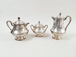 ODIOT, fin XIXe siècle : paire de grands plats ronds en métal doublé argent, modèle à lauriers rubanés. Monogramme AK sur l’aile. Poinçons de doublé et numérotés 249. Diam. 35.5 cm. Légères rayures. TBE.