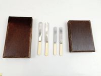 SHEFFIELD, ANGLETERRE, XXe siècle, pour la maison PRODUX : Suite de 12 grands et 12 petits couteaux à manches en ivoirine, les bords à pans et les culots arrondis. Les lames inoxydables. Travail anglais pour la maison Française PRODUX. 2 écrins. Légères rayures. TBE. Non chiffrés.